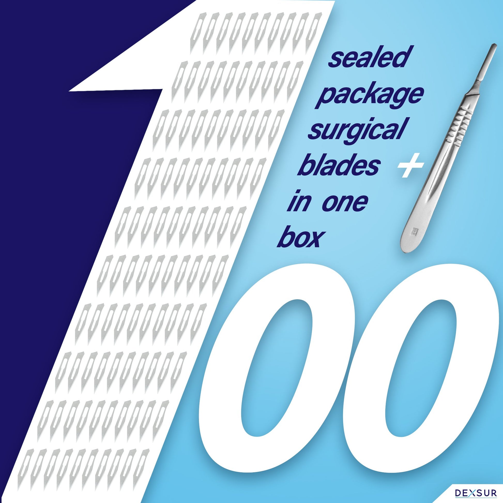 DEXSUR Scalpel Blades Sterile High Carbon Steel Dermablade, # 25 Surgical Blade - Individually Wrapped, a box of 100 Pcs + # 4 Scalpel Handle